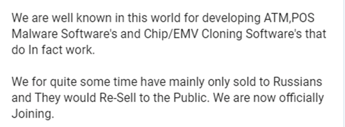 In 2019, a website claiming to be affiliated with Prilex started offering what it said was a malware package created by the group. We have little confidence in these claims: the site could be operated by copycats trying to impersonate the group and catch some money using the reputation Prilex has earned over the years.